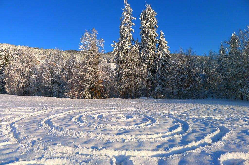 Jeder von uns macht oder hinterlässt Spuren auf dieser Erde. Und jede Spur ist einzigartig! Heute legen wir unsere ganz persönlichen Spuren in eine weiss gehüllte, verzauberte Landschaft, in ein verschneites Tal mit glitzernden Schneekristallen. Ruhe und Stille herrscht hier im Winterwald. Vor unserem Auge entsteht im Schnee ein neues Bild.