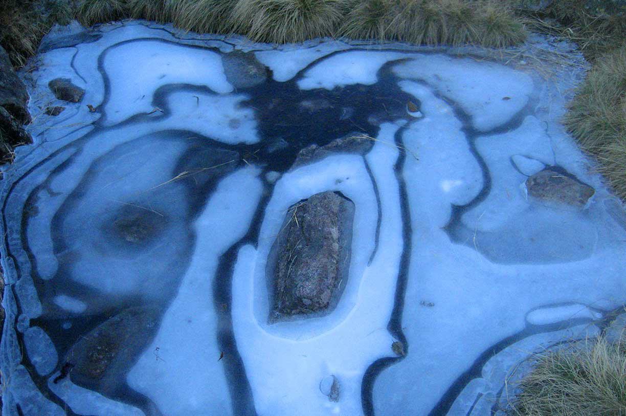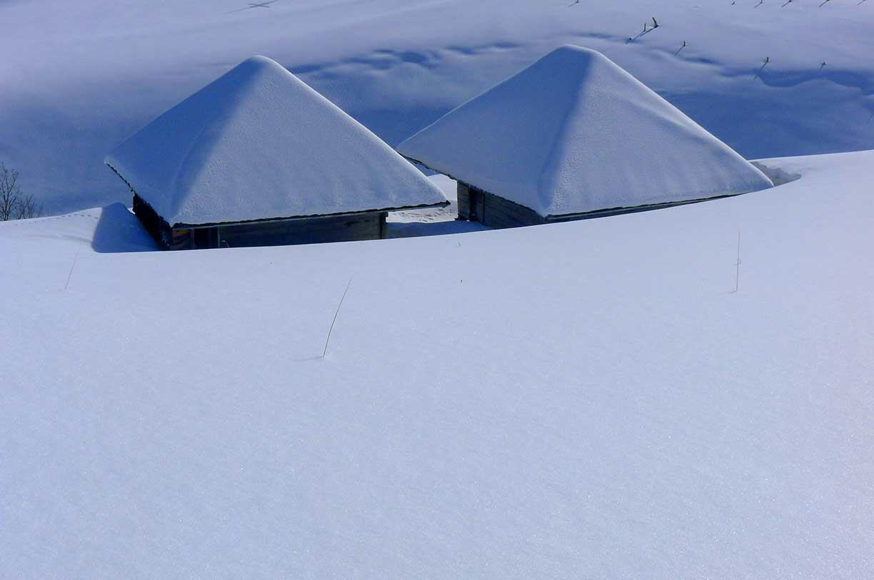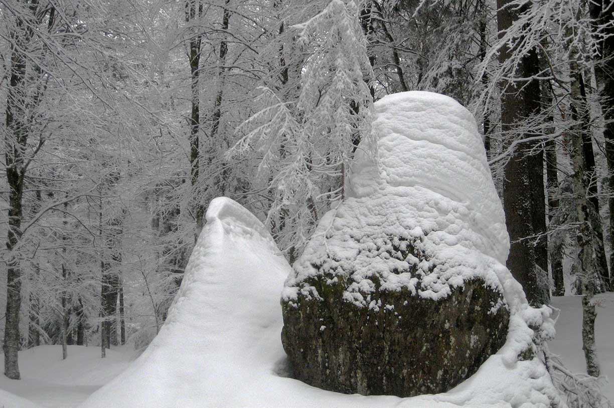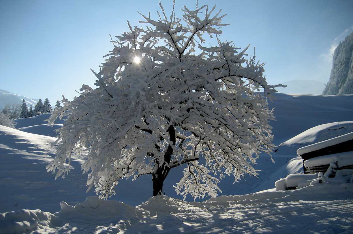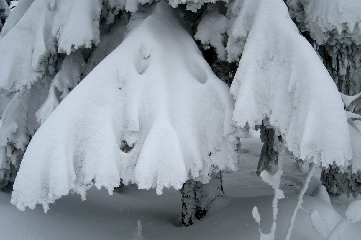 Sie entdecken die winterliche Schönheit in den Urelementen Wasser, Luft und Licht. Im Neuschnee ist die Natur wie eine Kunstausstellung, ein riesiger Schneepalast, voller hängender weisser Gärten an den Bäumen. Wir sind mit Schneeschuhen unterwegs. Die Handschrift des Winters